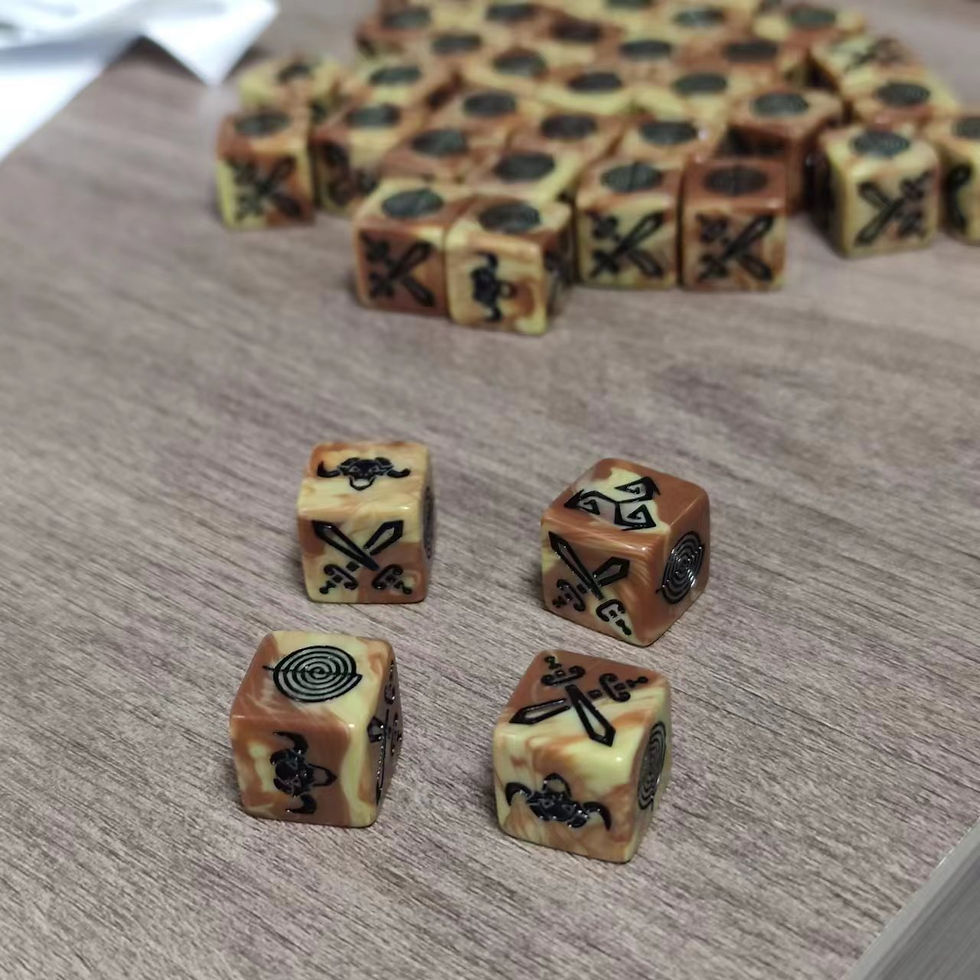 We have now completed the Relic deck for TTV and the one for Crypt is also finished. These are now all print ready files. We are looking to continue this process with Enemy Scrolls and Hero Skill cards, before we begin the Nightmare Mode stuff. We are going to be making new map editing software for the game for my ease of design with Crypt. So that's a lot more to get done but we've made a lot of progress. Also we have heard from our manufacturer in regards the custom dice for the prototypes and can show you a photo! We'll keep you updated as we continue to progress. Paul and I might entertain you with short stories and vignettes as he's been writing Veil related fiction when he's on breaks at work. I've enjoyed them and think it might be fun to have him post them on the forum.
